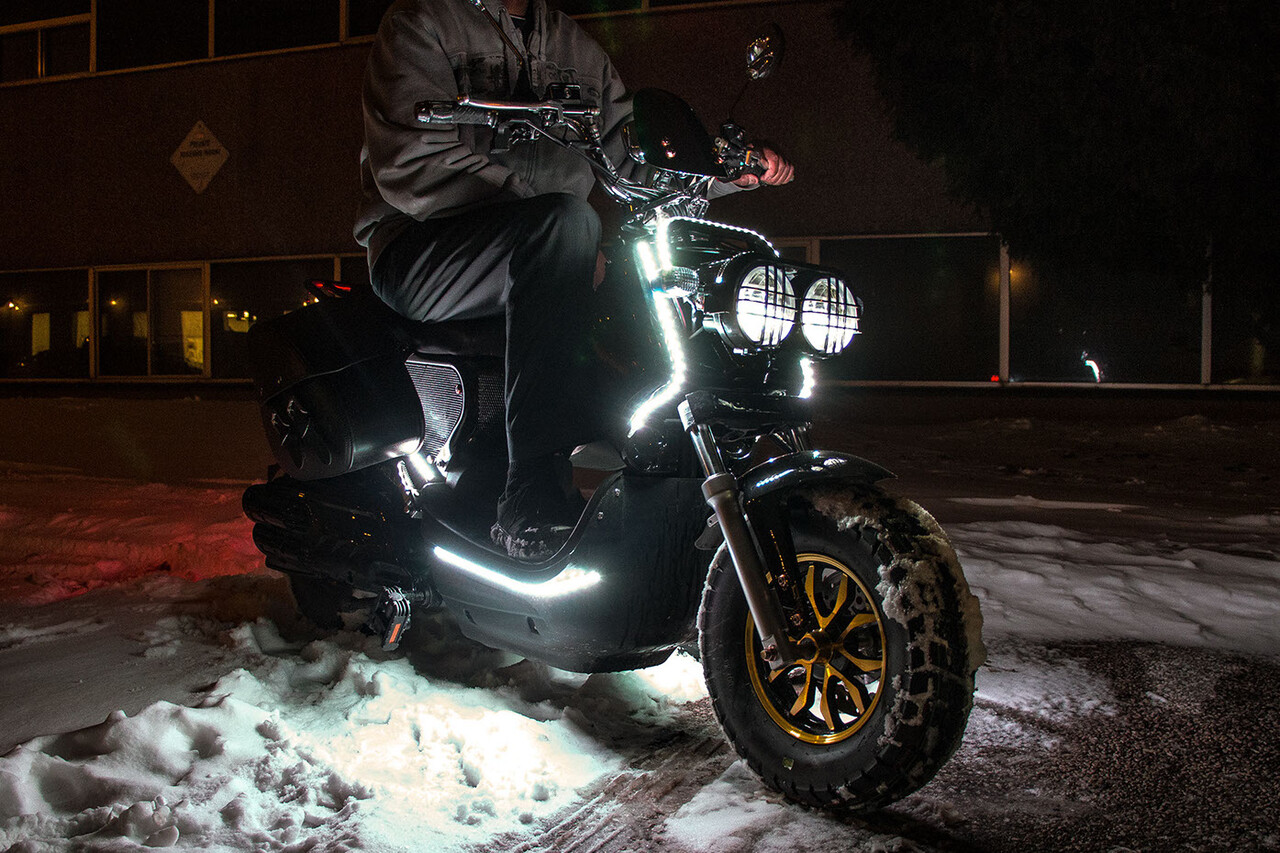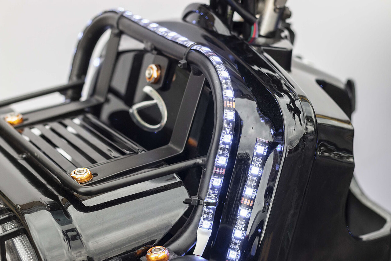El scooter está equipado con iluminación LED RGB que se puede configurar en cualquier color. La iluminación se puede controlar a través de una aplicación para Android e iOS.